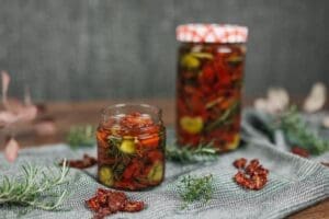- Poté sceďte a naložte do skleniček. Vrstvěte sušená rajčata, čerstvé či sušené bylinky (tymián, bazalku, rozmarýn…), česnek nakrájený na plátky, a pokud chcete, tak přidejte i chilli papričku.